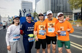 张其尤(左三)在陪跑员的带领下,顺利完成自己的第一次半马,赛后他在终点处激动落泪。当比赛还有不到10...