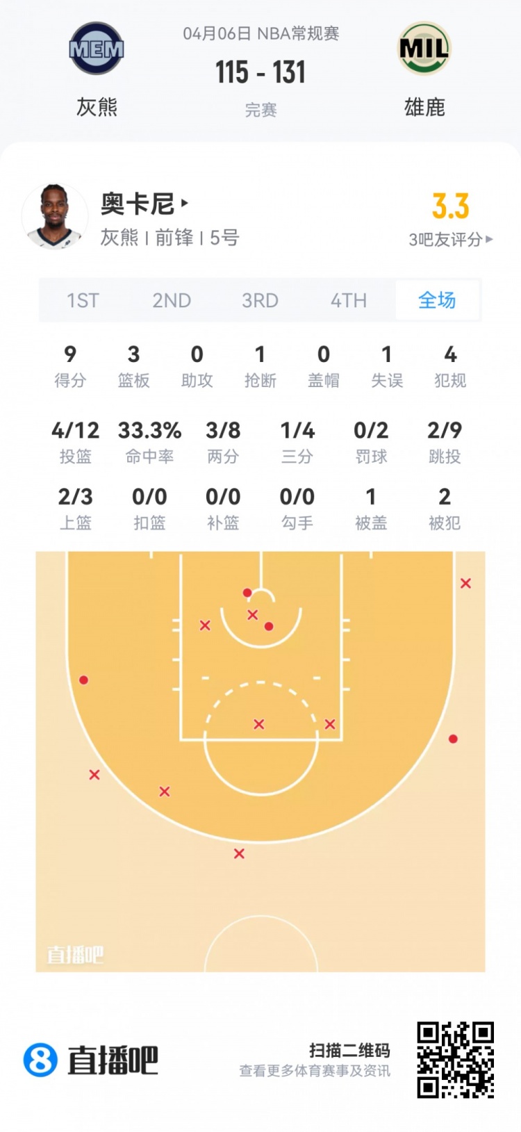 灰熊落选秀托比·奥卡尼 登场41.2分钟